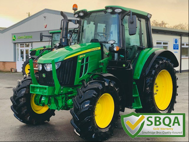 EX DEMO JOHN DEERE 6120M. 40KPH AUTOQUAD, SUSPENDED AXLE, 114LPM PFC HYD PUMP, 3 REAR & 2 MID MECHANICAL VALVES, PANORAMIC GLASS ROOF. ON 480/70R38 & 420/70R24 TRELLEBORG. READY TO TAKE JOHN DEERE LOADER WITH MULTI COUPLER. AVAILABLE WITH 0% FINANCE & POWERGARD PLUS EXTENDED WARRANTY TO 3000 HOURS.