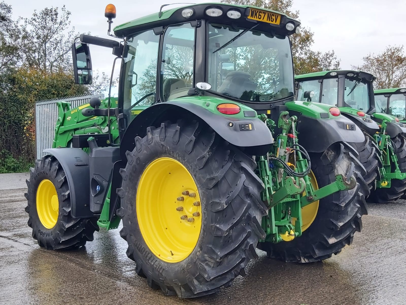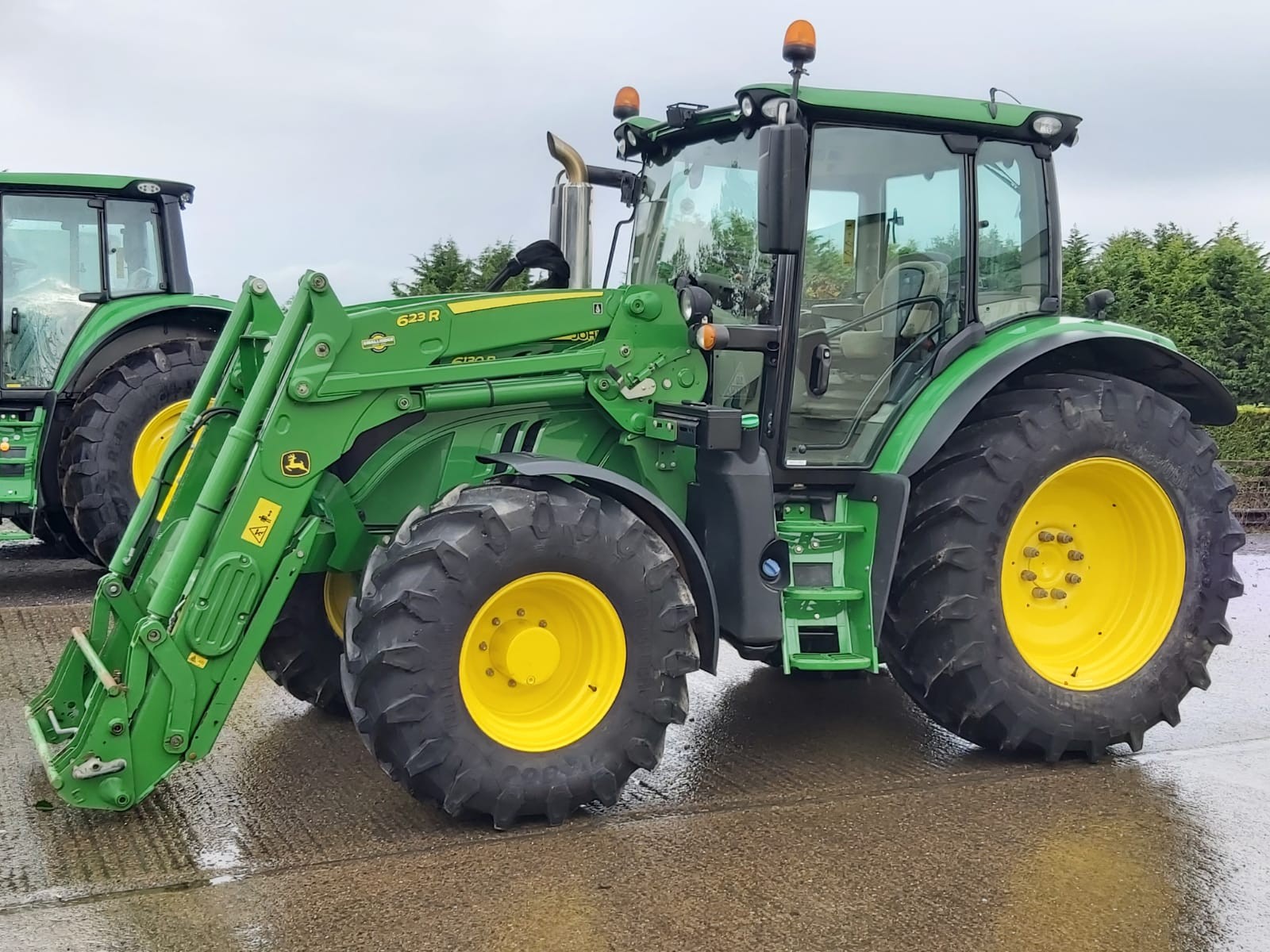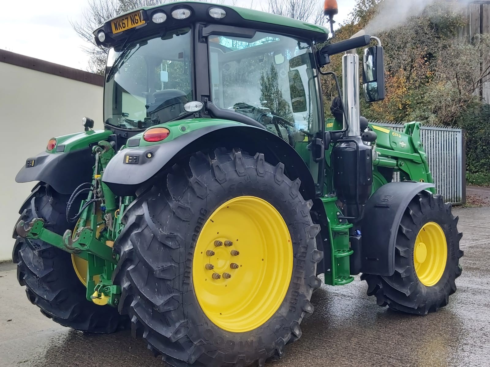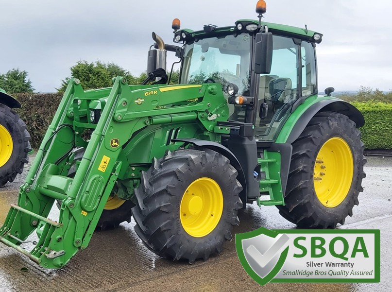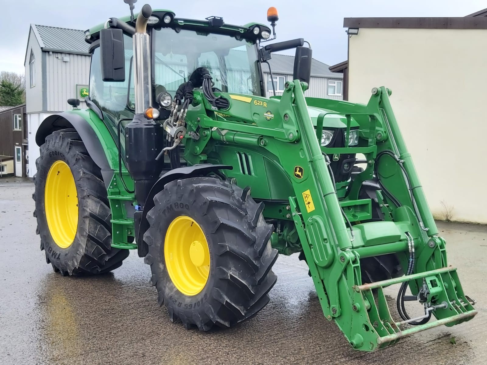 2017 JOHN DEERE 6130R. 50KPH AUTOQUAD, FULL SUSPENSION, 3 ELECTRIC REAR & 2 MECHANICAL MID VALVES, HYDRAULIC TOPLINK, AIR TRAILER BRAKES, GREENSTAR & ISOBUS READY, STAINLESS EXHAUST, ELECTRIC MIRRORS. WITH 623R SELF LEVELLING LOADER, MULTI COUPLER, LIVE 3RD SERVICE. ON 600/65R38 & 540/65R24 TRELLEBORG