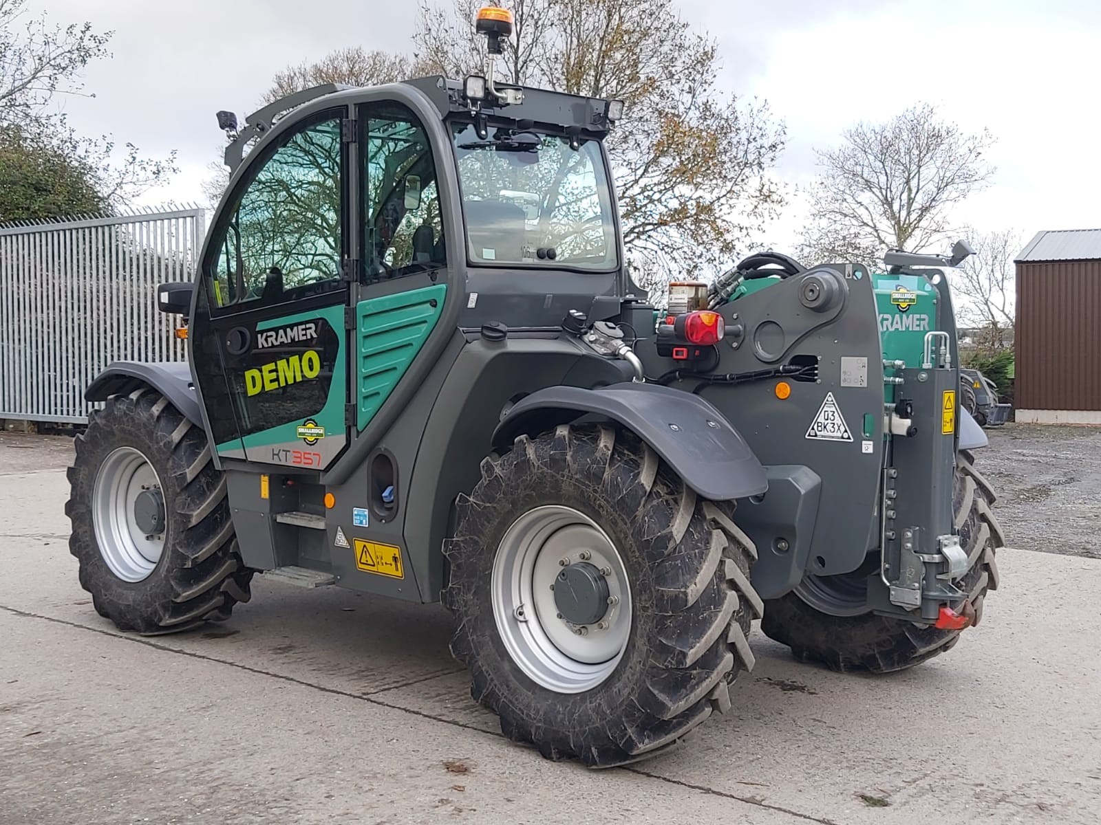 EX DEMO KRAMER KT 357. 136HP DEUTZ ENGINE WITH REVERSING FAN, 40KPH ECOSPEED TRANSMISSION, RAISED AIR CONDITIONED CAB, BOOM SUSPENSION, HYDRAULIC LOCKING PIN & CONE CARRIAGE, TRAILER PICK-UP HITCH & AUTOLUBE. ON 460/70R24 MICHELIN TYRES. KRAMER EXTENDED WARRANTY TO OCTOBER 2027 OR 3000 HOURS.