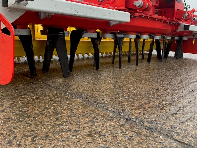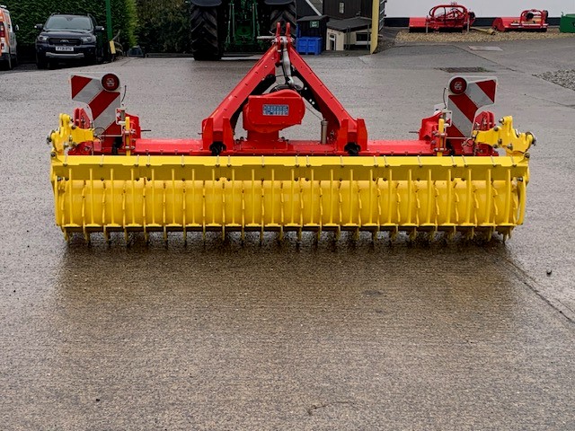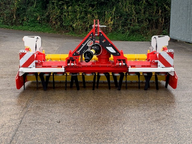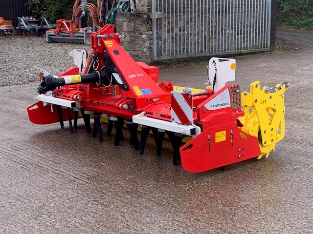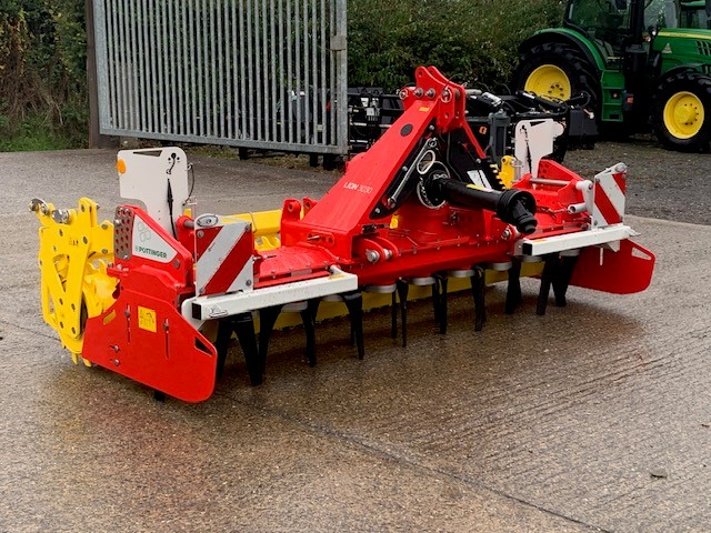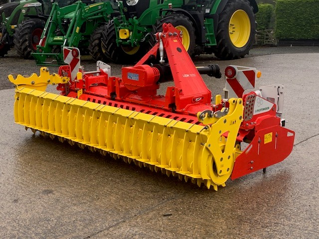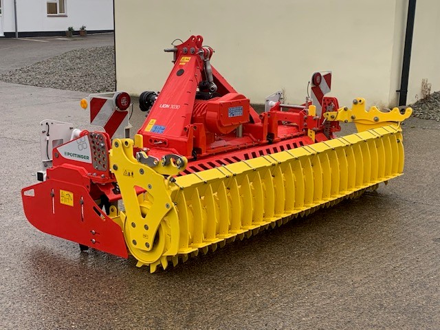 NEW POTTINGER LION 3030 3 METRE POWER HARROW. 1000RPM GEAR BOX RATED TO 200HP, 10 ROTORS WITH QUICK CHANGE TINES, 500mm TOOTHED PACKER ROLLER, 6 SPLINE PTO SHAFT WITH CAM CLUTCH, LED ROAD LIGHTING.