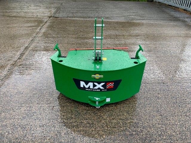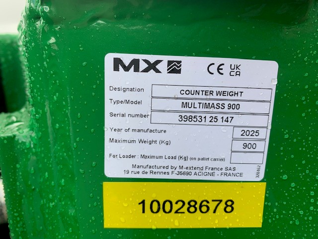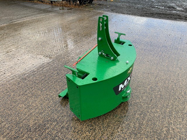 NEW MX 900KG MULTIMASS WEIGHT BLOCK. 3 POINT MOUNTING WITH TOP LINK BRACKET, ADJUSTABLE HITCHING HEIGHT & FRONT EXTREMITY MARKER. OPTION OF ADDING A FURTHER 400KG PIGGY BACK WEIGHT. FINISHED IN JOHN DEERE GREEN