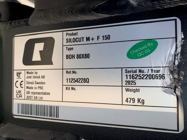 NEW QUICKE SILOCUT M+ 150F SHEAR GRAB. 1.5 METRE WORKING WIDTH, 0.95 M3 CAPACITY, 12 BOLTED IN Q-TINE'S, TWIN HYDRAULIC CYLINDERS, SECTIONAL BOLTED ON BLADES, HOSES & BOLTED ON EURO BRACKETS (OTHER BRACKETS AVAILABLE ON REQUEST). COMES WITH 2ND YEAR STRUCTURAL WARRANTY.