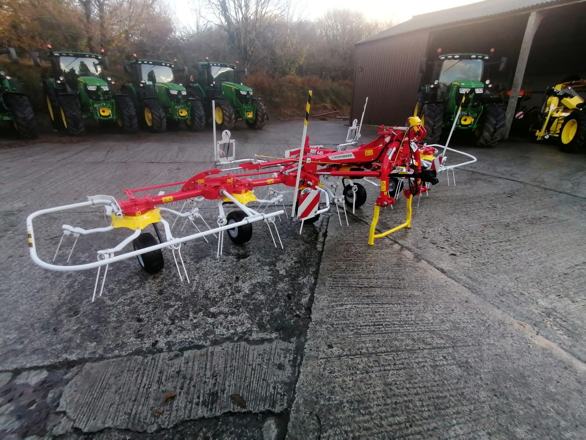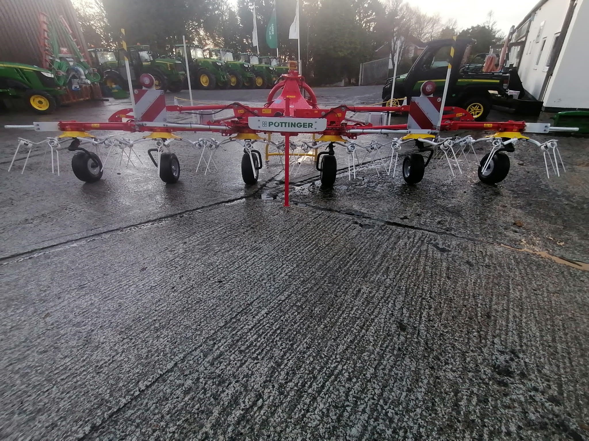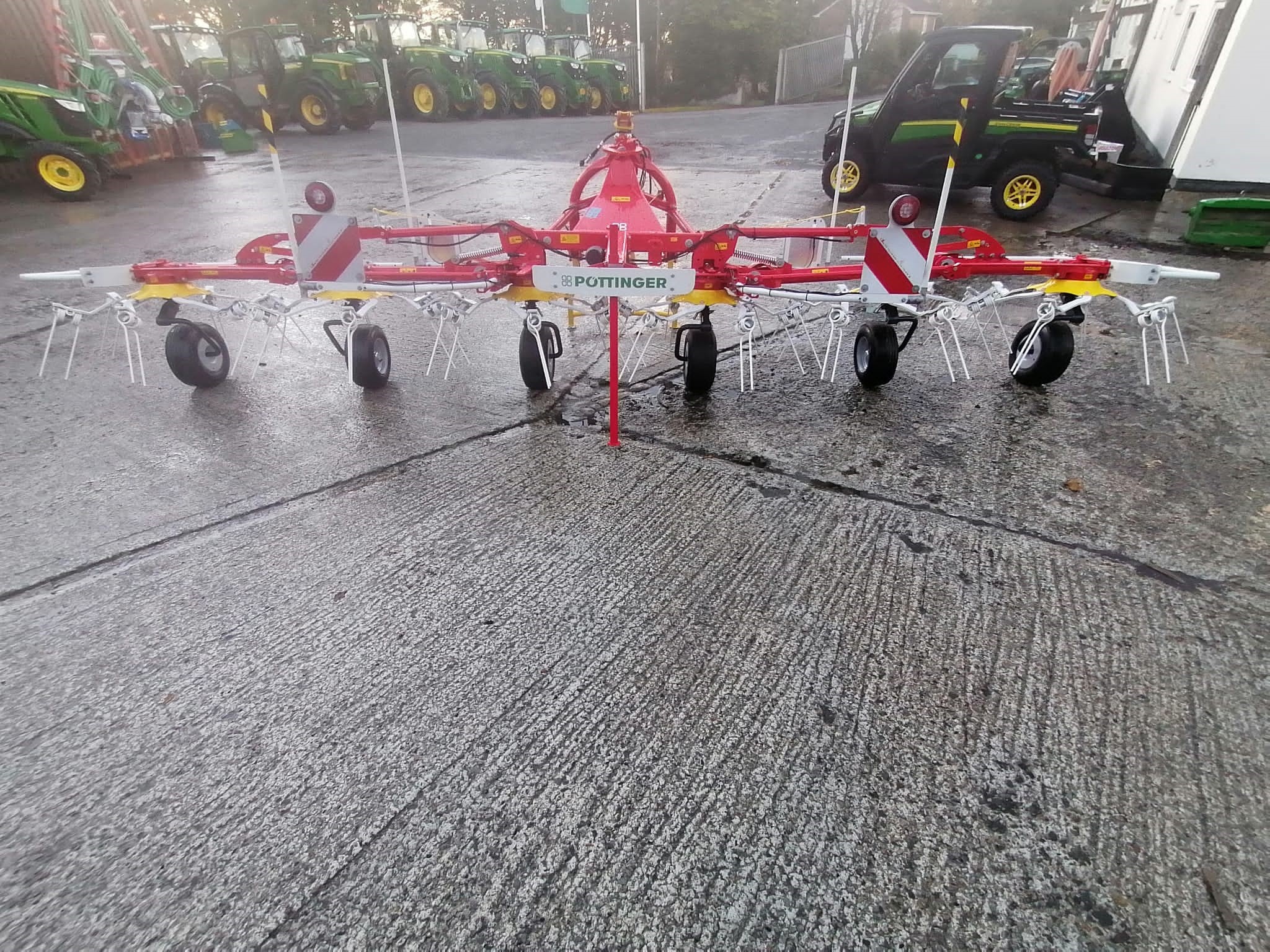 NEW POTTINGER HIT 6.69 TEDDER. 6.45 METRE WORKING WIDTH, 6 ROTORS WITH 6 ARMS PER ROTOR, 10mm DURASTAR TINES, MECHANICAL FENCELINE ADJUSMENT, MARKER BOARDS & ROAD LIGHTING.