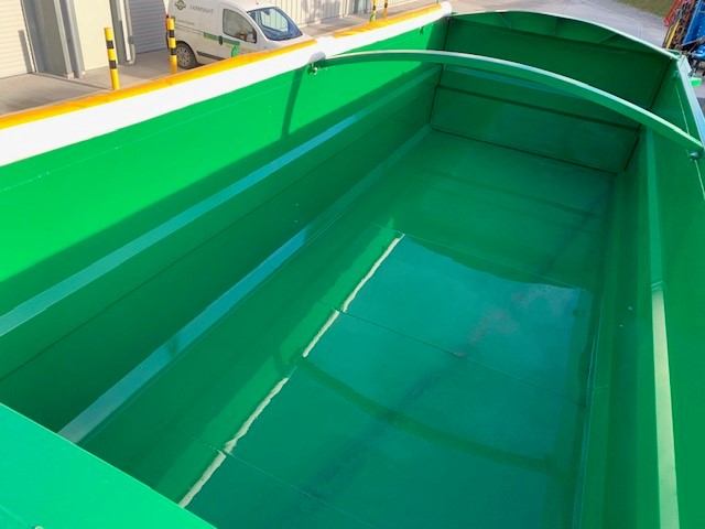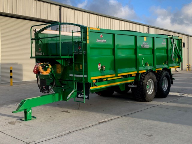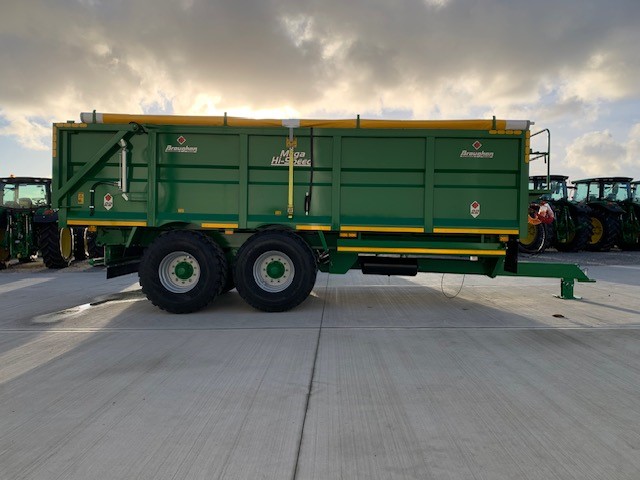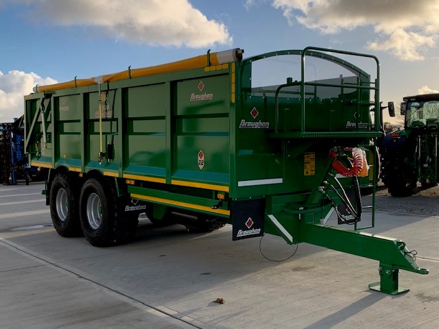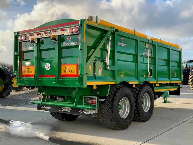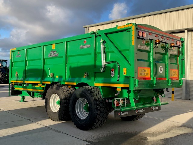 NEW BROUGHAN 16 TON ROOT CROP TRAILER. 22' x 8' x 4'6" BODY, HYDRAULIC UP & OVER DOOR, COMMERCIAL AXLES WITH AIR/HYD BRAKES & LSV ON AIR, 560/60R22.5 FLOTATION TYRES, REAR BUMPER BAR, ROLLOVER COVER & FRONT GANTRY, REAR FLASHING BEACON. FINISHED IN GREEN.