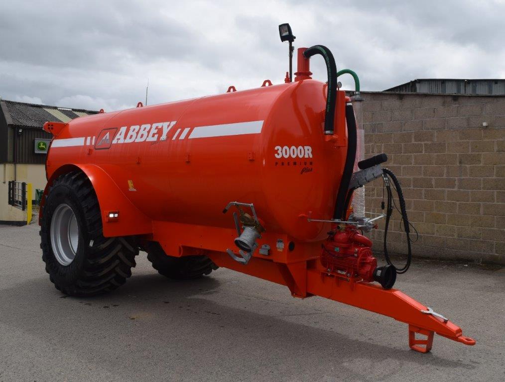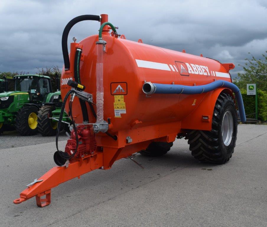 SHOP SOILED ABBEY 3000R PREMIUM PLUS TANKER. SPRUNG DRAWBAR, MEC 13500 PUMP, 150mm x 150mm COMMERCIAL AXLE WITH 420mmx180mm BRAKES, ON 800/65R32 ALLIANCE TYRES, 4 FILL POINTS - 2 WITH 6" QUICK ATTACH & 2 BLANKED OFF, 20' OF 6" SUCTION HOSE, FRONT LEVEL INDICATOR, LED LIGHTS & FLASHING BEACON.