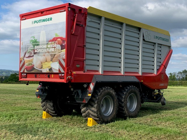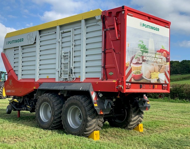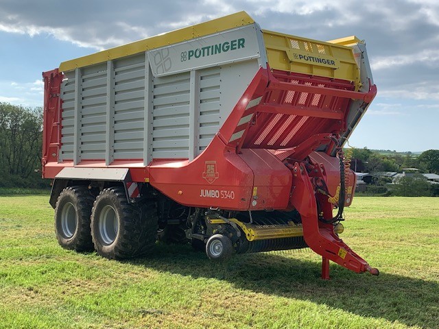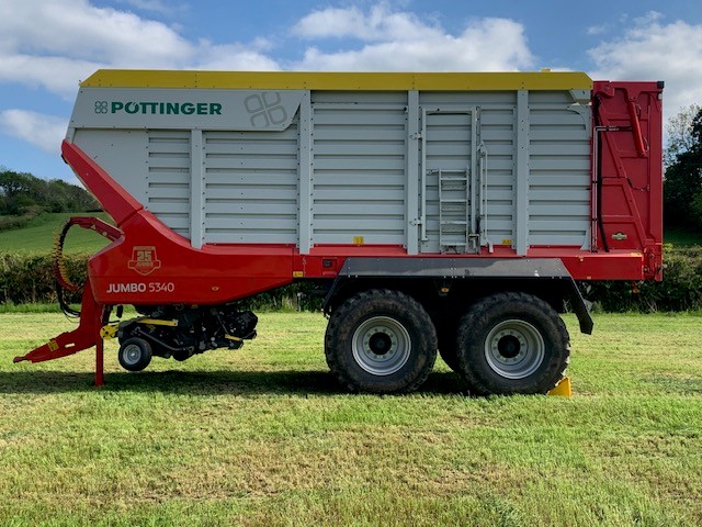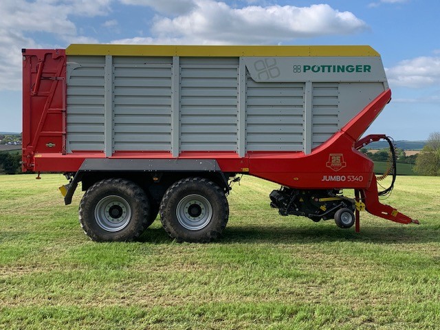 DEMO POTTINGER JUMBO 5340 FORAGE WAGON. 35.6 M3 DIN CAPACITY WITH MOVEABLE BULKHEAD, 1.89 METRE PICK-UP WITH CENTRAL ROLLER, 45 DURASTAR DOUBLE SIDED KNIVES GIVING A CHOP LENGTH OF 34mm, 80mm SPOON HITCH, PASSIVE STEERING REAR AXLE, AIR BRAKES, ISOBUS WITH CONTROL BOX. ON 710/50 R26.5 VREDESTIN TYRES.